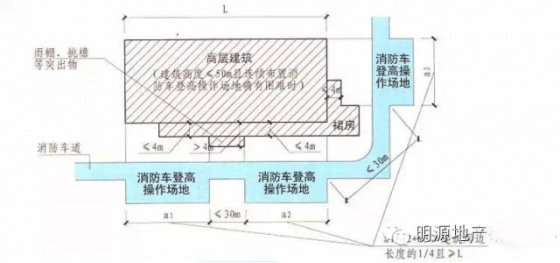3)對于建筑高度大于50米的建筑,操作場地的長度和寬度分別不應小于20米和10米,其他高層建筑,操作場地的長度和寬度分別不應小于15米和10米。