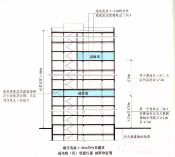 2.完善了公共建筑避難層的防火要求,如,第一個避難層(間)的樓地面至滅火救援場地地面的高度不應大于50米,兩個避難層(間)之間的高度不宜大于50米;