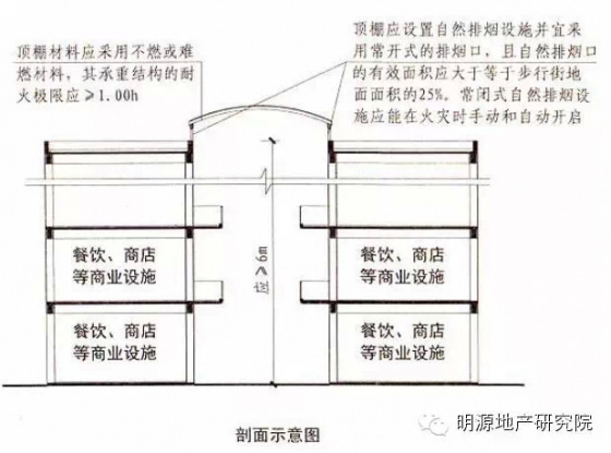 3.步行街的端部在各層均不宜封閉,確需封閉時,應在外墻上設(shè)置可開啟的門窗,且可開啟門窗的面積不應小于該部位外墻面積的一半。