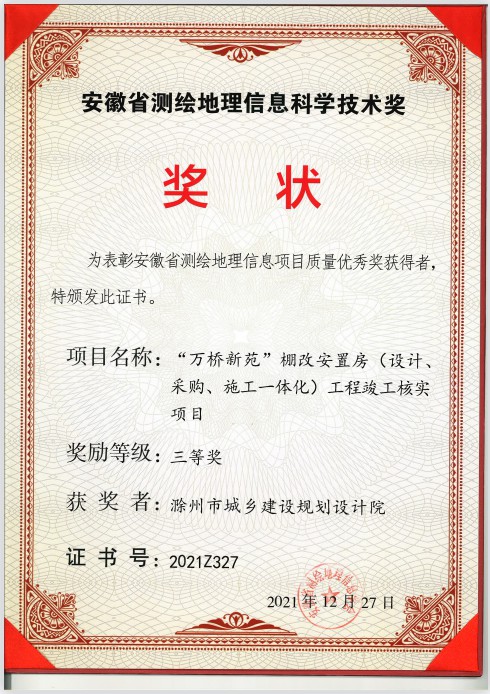 安徽省測繪地理信息科學技術獎三等獎